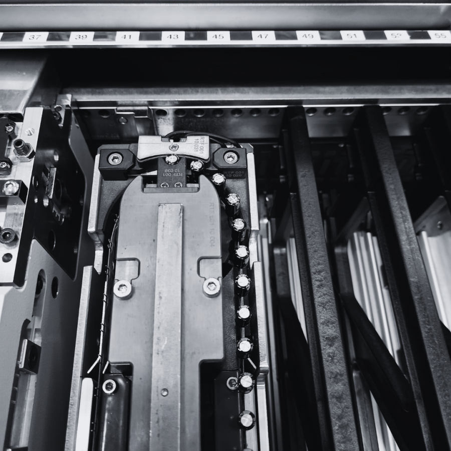 SEMO propose en option la fonction unique « z-ref »*. Sur un feeder RF équipe de cette fonction, chaque composant radial est mécaniquement référencé sur l’axe z avant la coupe.